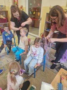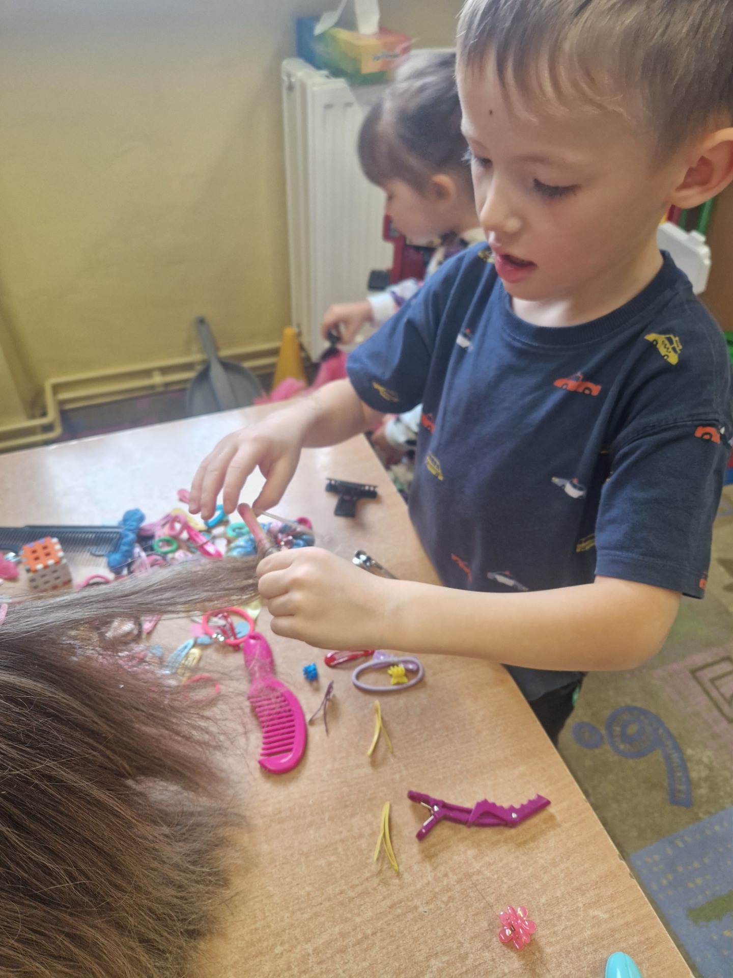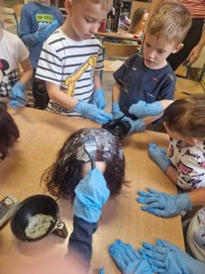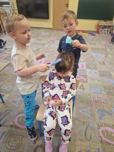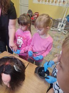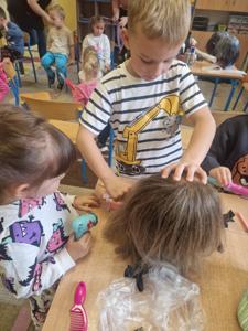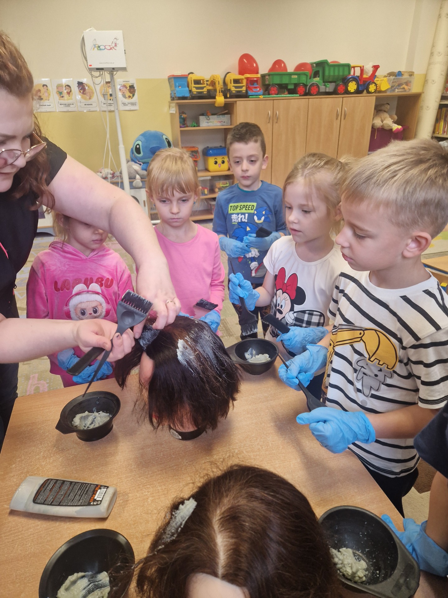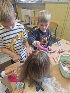 Kolorowe warkocze, włosy na żel a może farbowanie? Takie atrakcje tylko u nas. 8 października dzieci z oddziału przedszkolnego odwiedziła pani fryzjerka. Pani Ewelina, która na co dzień pracuje w salonie damsko-męskim ANETA w Szczytnikach opowiedziała dzieciom o zawodzie fryzjera. Dzieci nazywały poszczególne akcesoria fryzjerskie, a nawet mogły na chwilę poczuć się jak prawdziwi fryzjerzy. Dziękujemy pani Ewelinie i pani Justynie za bardzo ciekawe zajęcia.