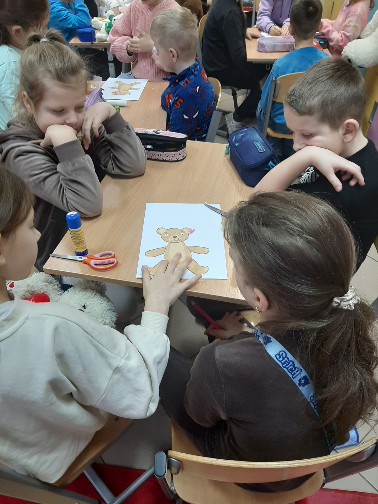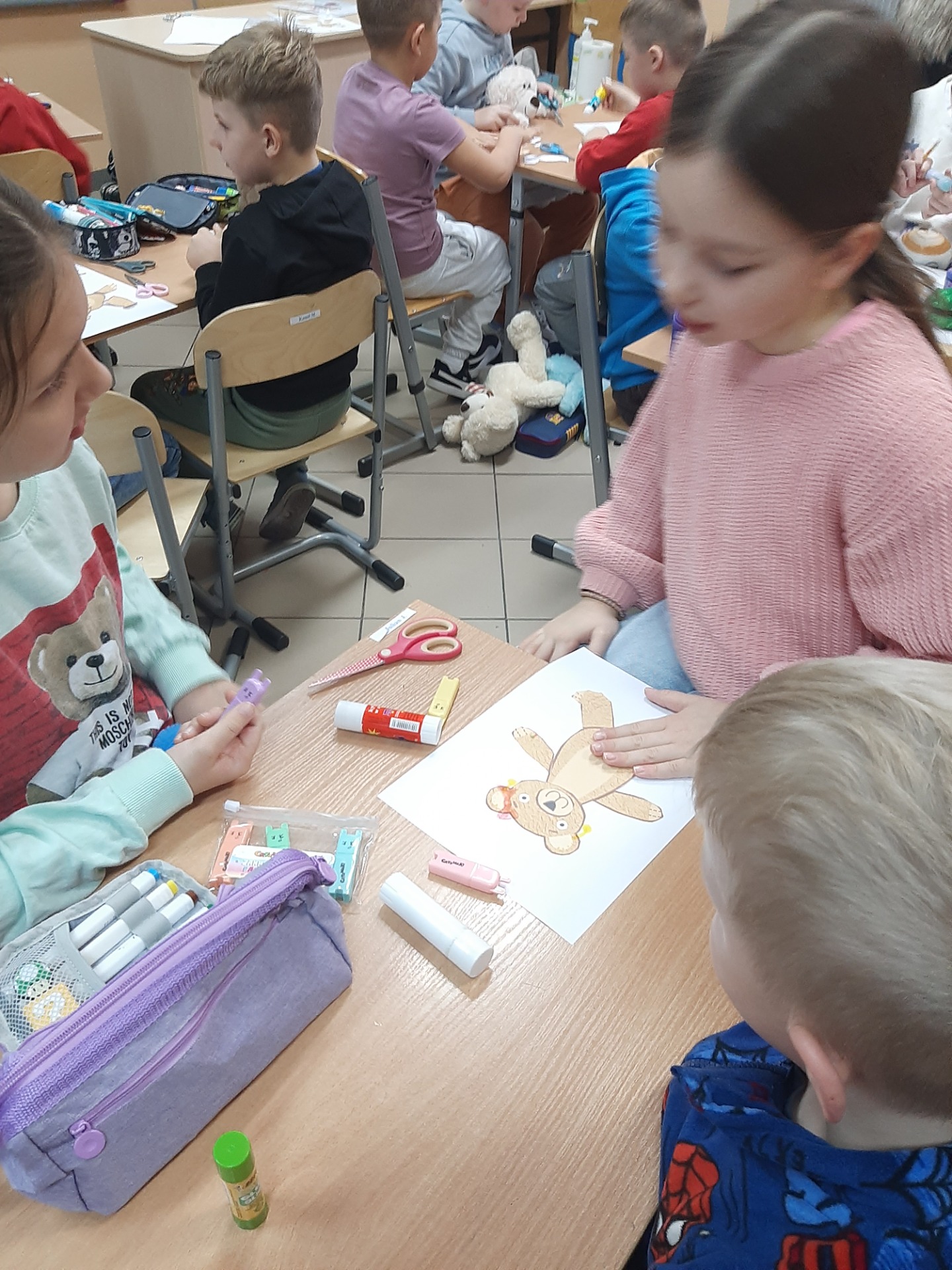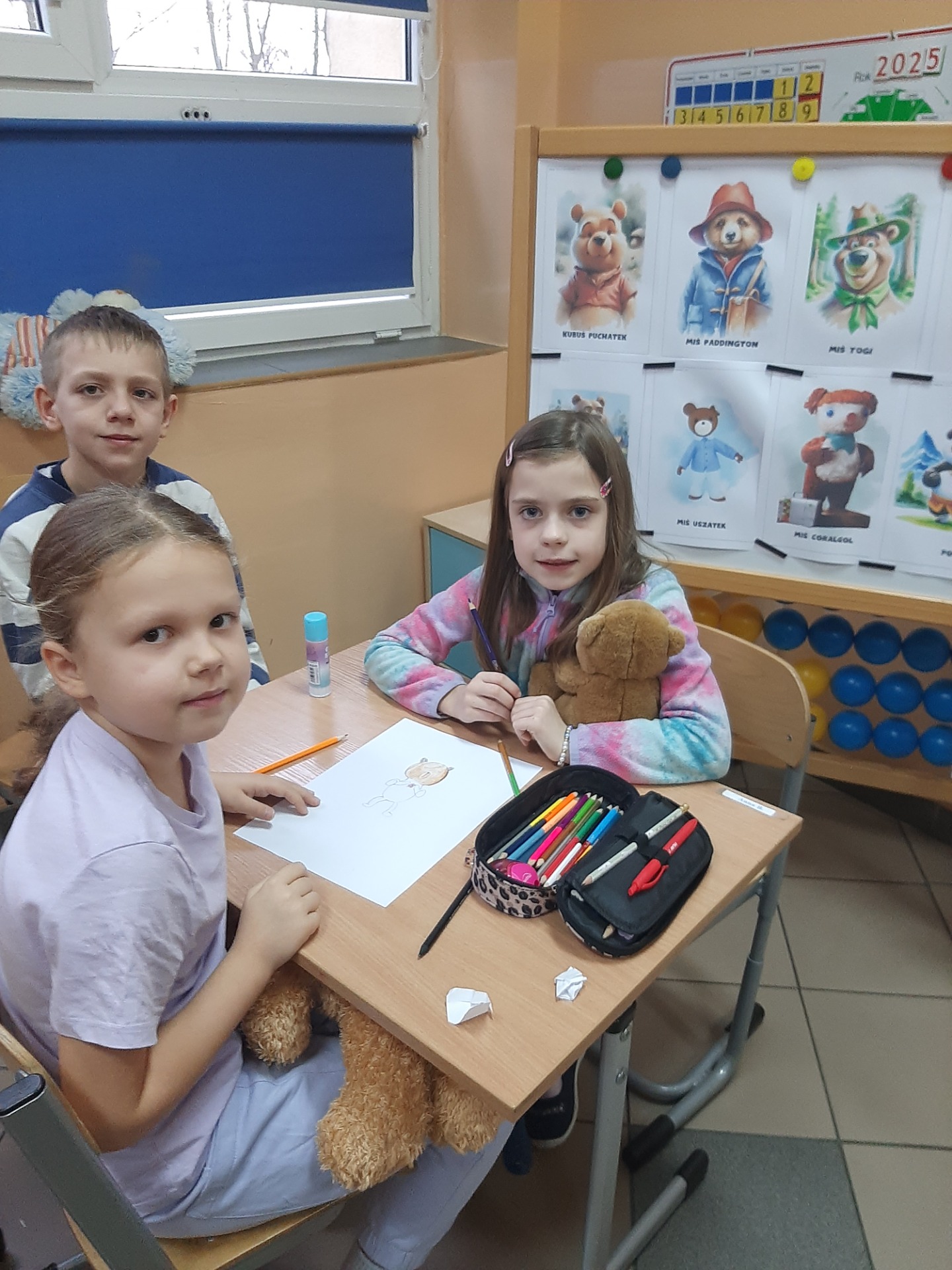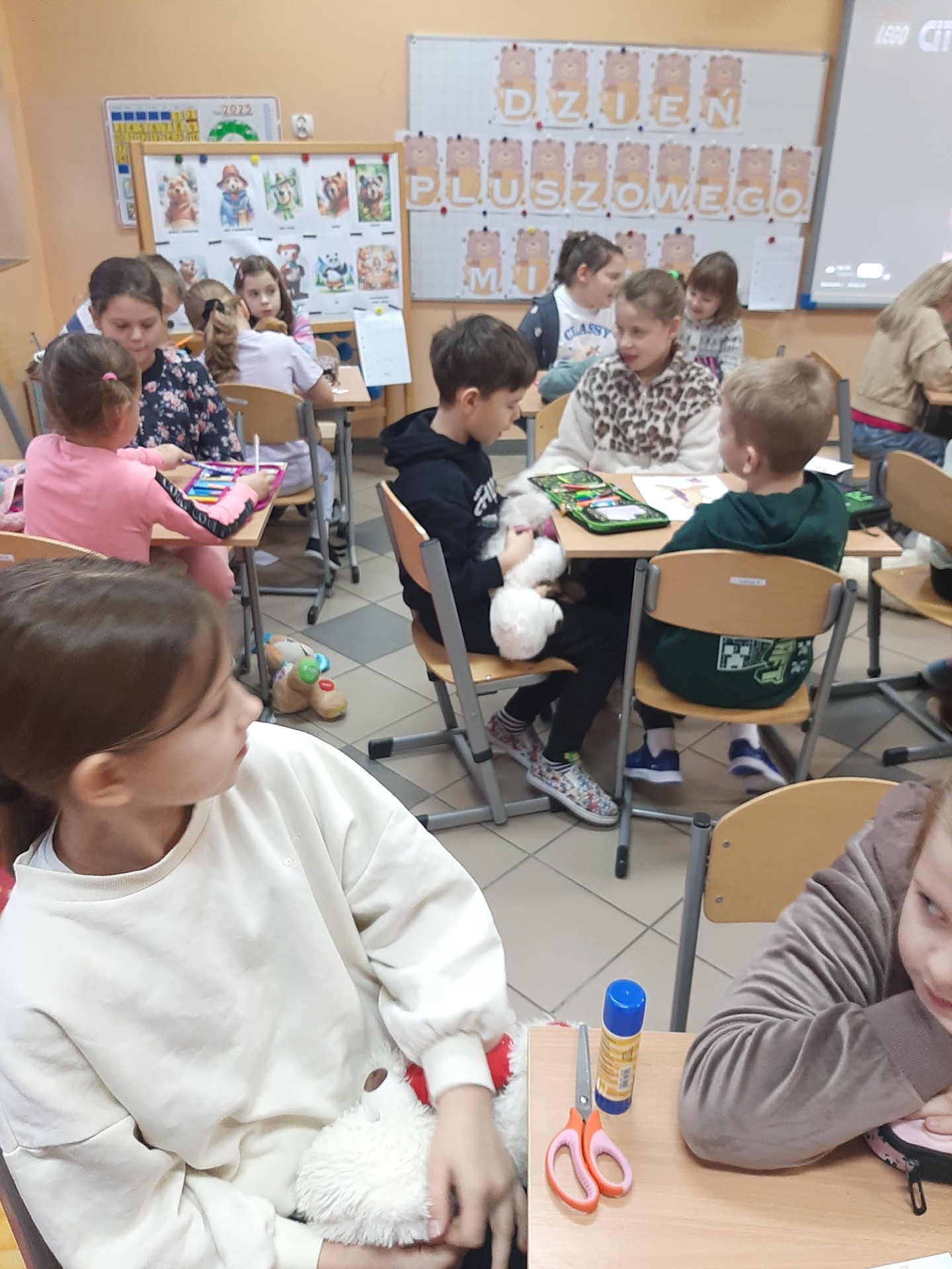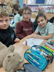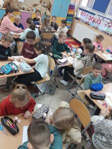 We wtorek 25 listopada 2025 r. uczniowie naszej szkoły z klas 1-3 przenieśli się do świata miękkich maskotek, świętując Dzień Pluszowego Misia. Tego wyjątkowego dnia w salach zagościły ulubione pluszaki dzieci, które stały się nie tylko bohaterami zajęć, ale też wiernymi towarzyszami wspólnej zabawy. Uczniowie rozpoczęli świętowanie od poznania krótkiej historii pluszowego misia oraz przypomnienia sobie znanych i lubianych misiów z bajek i książek, takich jak Miś Uszatek, Kubuś Puchatek czy Paddington. Następnie dzieci – pracując w grupach – tworzyły własne misiowe postacie. Z przygotowanych elementów składały „nowego misia”, uzupełniały go o rozmaite dorysowane przedmioty, a na koniec nadawały mu imię. Wspólna praca sprzyjała integracji, budowała atmosferę współdziałania oraz rozwijała wyobraźnie uczniów.
