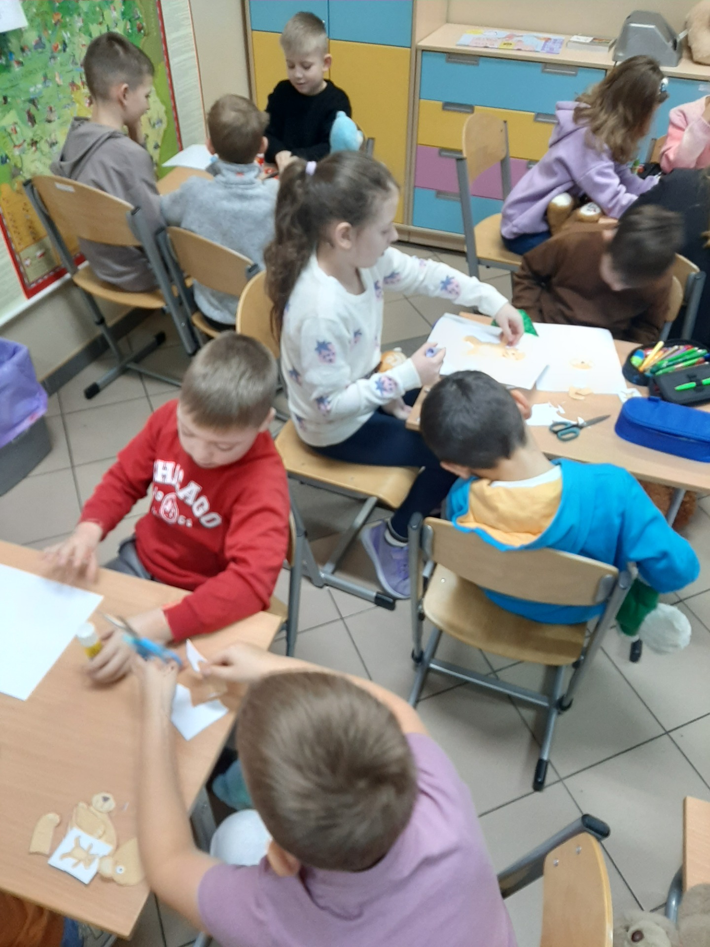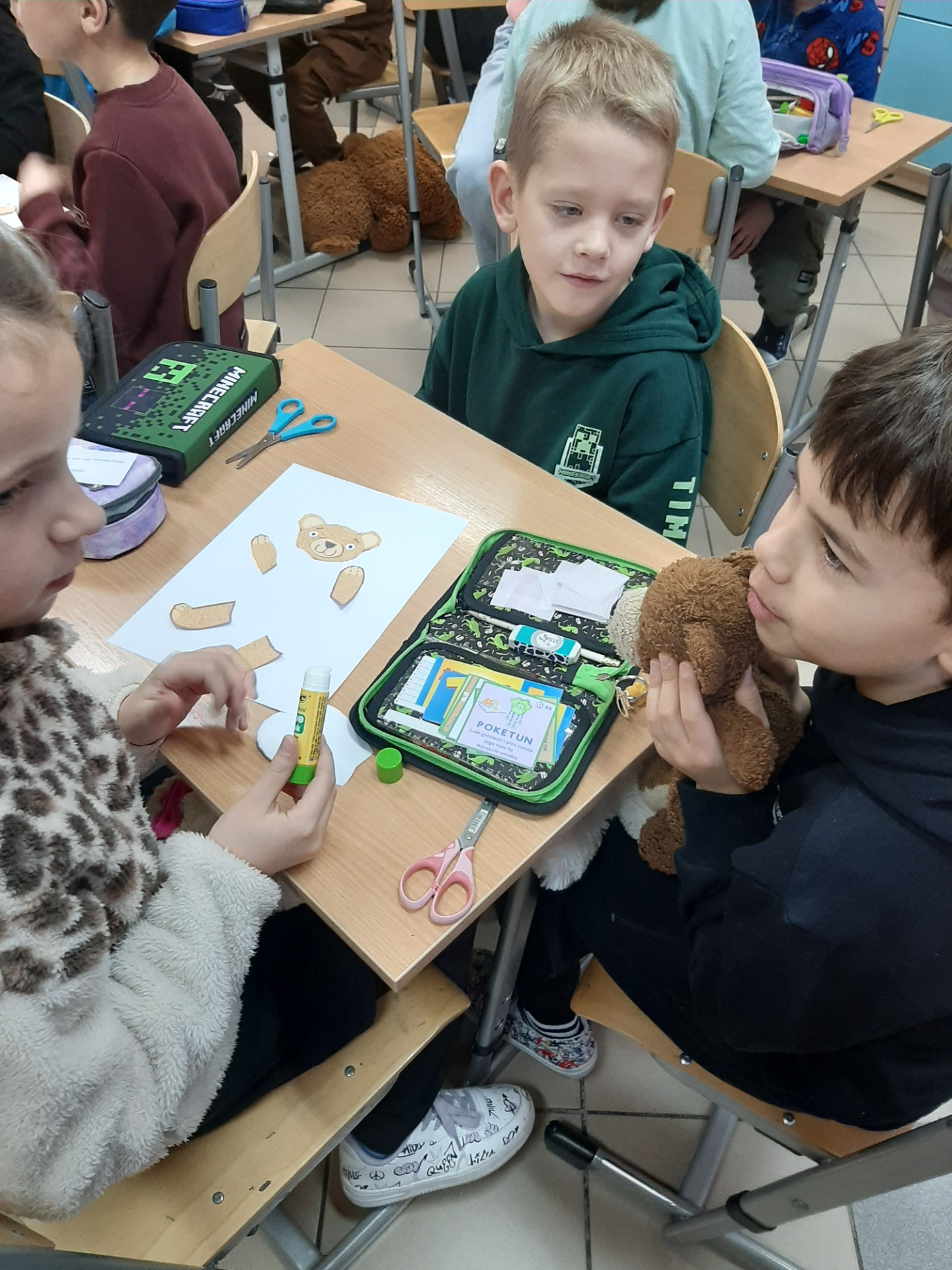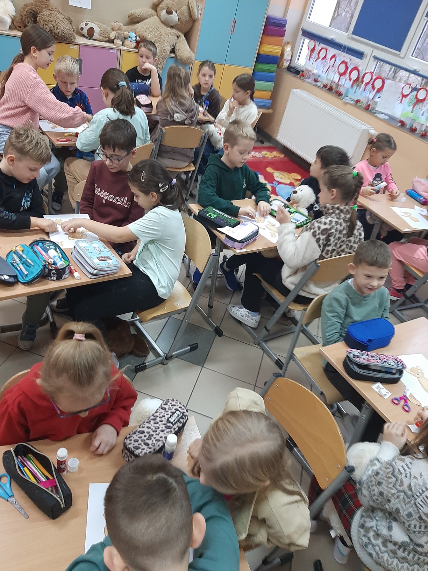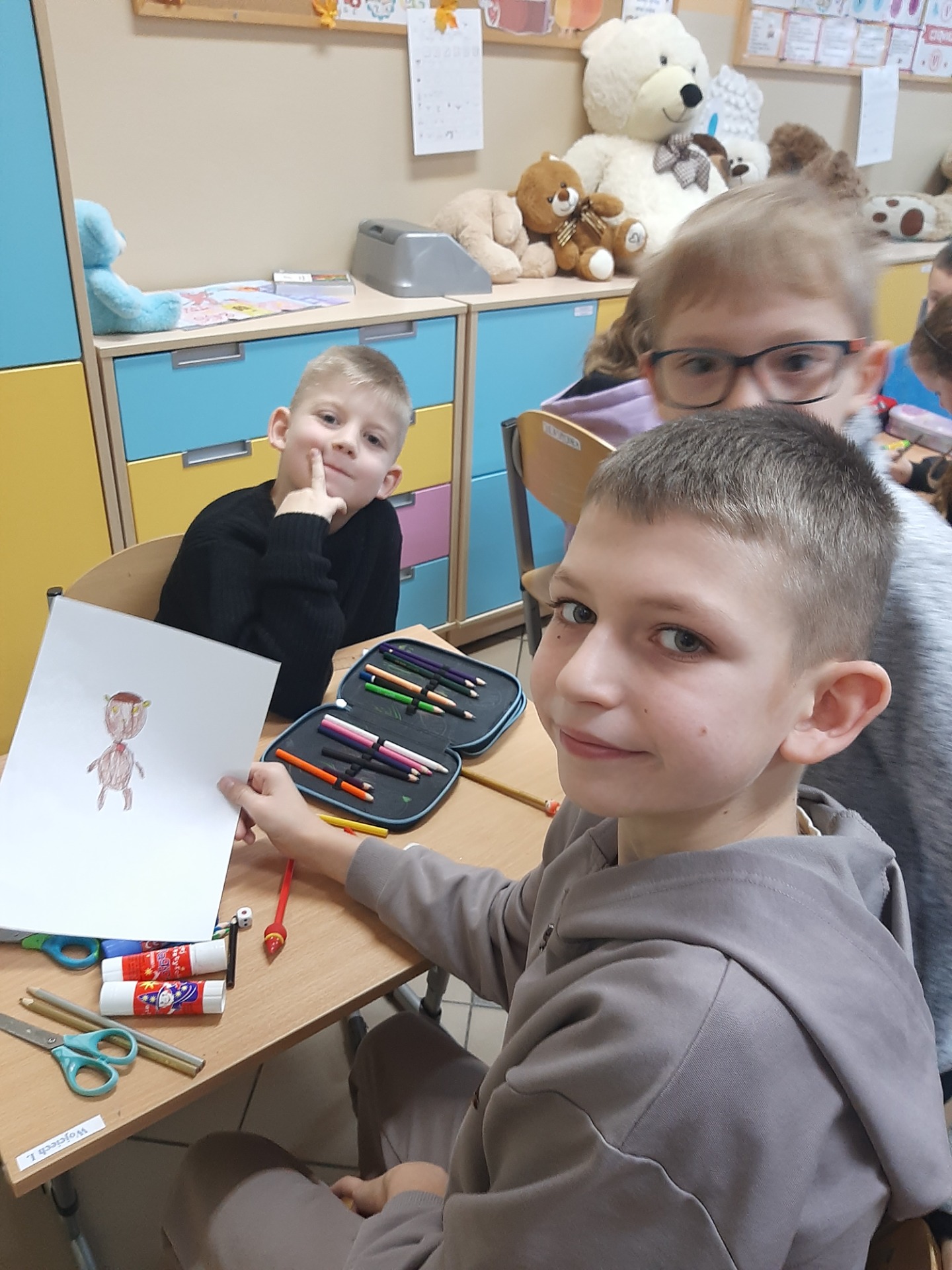 We wtorek 25 listopada 2025 r. uczniowie naszej szkoły z klas 1-3 przenieśli się do świata miękkich maskotek, świętując Dzień Pluszowego Misia. Tego wyjątkowego dnia w salach zagościły ulubione pluszaki dzieci, które stały się nie tylko bohaterami zajęć, ale też wiernymi towarzyszami wspólnej zabawy. Uczniowie rozpoczęli świętowanie od poznania krótkiej historii pluszowego misia oraz przypomnienia sobie znanych i lubianych misiów z bajek i książek, takich jak Miś Uszatek, Kubuś Puchatek czy Paddington. Następnie dzieci – pracując w grupach – tworzyły własne misiowe postacie. Z przygotowanych elementów składały „nowego misia”, uzupełniały go o rozmaite dorysowane przedmioty, a na koniec nadawały mu imię. Wspólna praca sprzyjała integracji, budowała atmosferę współdziałania oraz rozwijała wyobraźnie uczniów.
